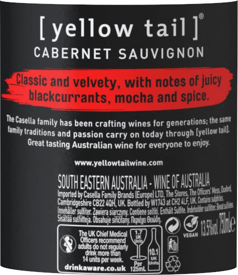 Dieser Wein legt den Fokus klar auf eine Rebsorte, und zwar auf Cabernet Sauvignon. Für diesen außergewöhnlich balancierten reinsortigen Wein von Yellow Tail wurde nur erstklassiges Lesegut geerntet. Nach der Lese gelangen die Trauben umgehend in die Kellerei. Hier werden sie sortiert und behutsam aufgebrochen. Es folgt die Gärung im Edelstahltank bei kontrollierten Temperaturen. Der Vergärung schließt sich eine Reifung für einige Monate auf der Feinhefe an, bevor der Wein schließlich in Flaschen abgefüllt wird.