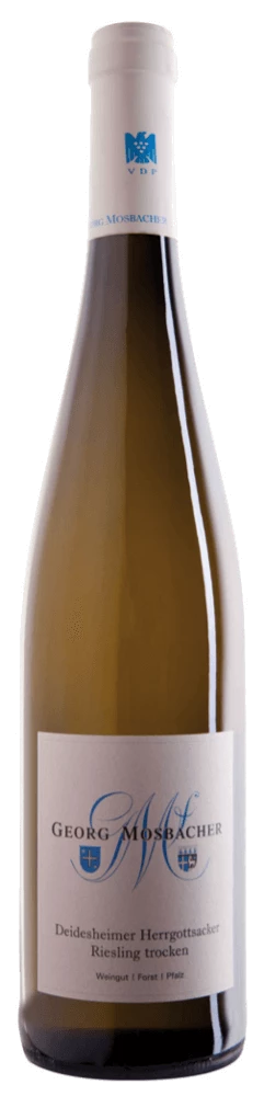 Der Deidesheimer Herrgottsacker Riesling von Georg Mosbacher offenbart sich im Glas in einem hellen Gelb mit den intensiven Noten von grünen Äpfeln, welche von kräutrigen und mineralischen Nuancen untermalt werden.