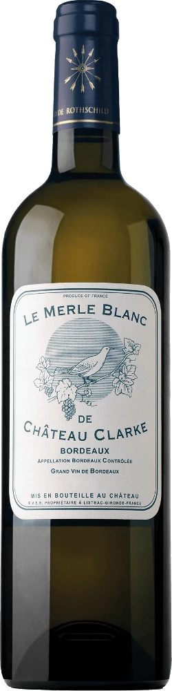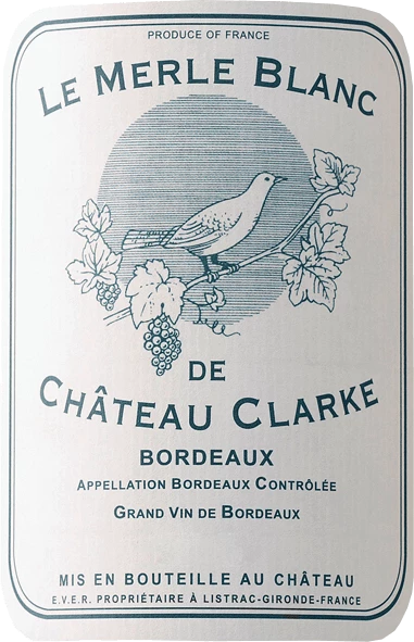 Der elegante Le Merle Blanc de Château Clarke aus Frankreich ist eine Cuvée, gekeltert aus den Rebsorten Muscadelle, Sauvignon Blanc und Semillon. Im Bordeaux wachsen die Reben, die die Trauben für diesen Wein hervorbringen auf Böden aus Kalkstein, Ton und Mergel. Nach der Weinlese gelangen die Trauben zügig in die Kellerei. Hier werden sie sortiert und behutsam aufgebrochen. Anschließend erfolgt die Gärung im kleinen Holz bei kontrollierten Temperaturen. Der Vergärung schließt sich eine Reifung für einige Monate auf der Feinhefe an, bevor der Wein schließlich abgefüllt wird.
