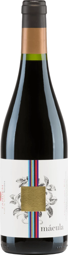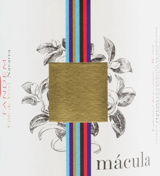 Mácula von Vitivinicola Tandem ist eine innovative spanische Cuvée aus den Rebsorten Cabernet Sauvignon und Merlot aus der D.O. Navarra in Norden Spaniens. Übersetzt bedeutet Mácula der Kunstfleck, der auf dem Etikett symbolisiert wird.