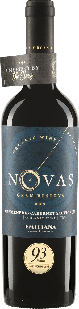 Grundlage für den kraftvollen Novas Carménère-Cabernet Sauvignon Gran Reserva aus Chile sind Trauben aus den Rebsorten Cabernet Sauvignon und Carmenère. Nach der Handlese gelangen die Weintrauben umgehend in die Kellerei. Hier werden sie selektiert und behutsam aufgebrochen. Es folgt die Gärung im kleinen Holz bei kontrollierten Temperaturen. Nach ihrem Ende wird der biologisch erzeugte Novas Carménère-Cabernet Sauvignon Gran Reserva noch für einige Monate in Barriques aus Eichenholz ausgebaut. Nach der Fertigstellung des Weins wird der Novas Carménère-Cabernet Sauvignon Gran Reserva behutsam harmonisiert.