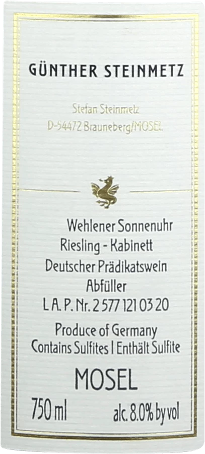 Dieser elegante Weißwein aus Deutschland wird aus der Rebsorte Riesling hergestellt. An der Mosel wachsen die Reben, die die Trauben für diesen Wein hervorbringen auf Böden aus Schiefer. Die Trauben dieses Spitzenweins von Günther Steinmetz wachsen zudem nicht etwa im Flachland, sondern graben in Steillagen ihre Wurzeln in den Boden. Der Steillagenanbau stellt sicher, dass auch in weniger sonnenverwöhnten Regionen mit kürzeren Vegetationsperioden die Rebstöcke ein Maximum an Sonne einfangen. Die Weinbeeren für diesen Weißwein aus Deutschland werden, nachdem die optimale Reife sichergestellt wurde, ausschließlich von Hand gelesen. Nach der Lese gelangen die Weintrauben umgehend ins Presshaus. Hier werden Sie selektiert und behutsam aufgebrochen. Es folgt die Gärung bei kontrollierten Temperaturen. Nach dem Abschluss der Gärung wird der Wehlener Sonnenuhr Riesling Kabinett noch für einige Monate in Fässern aus Eichenholz ausgebaut.